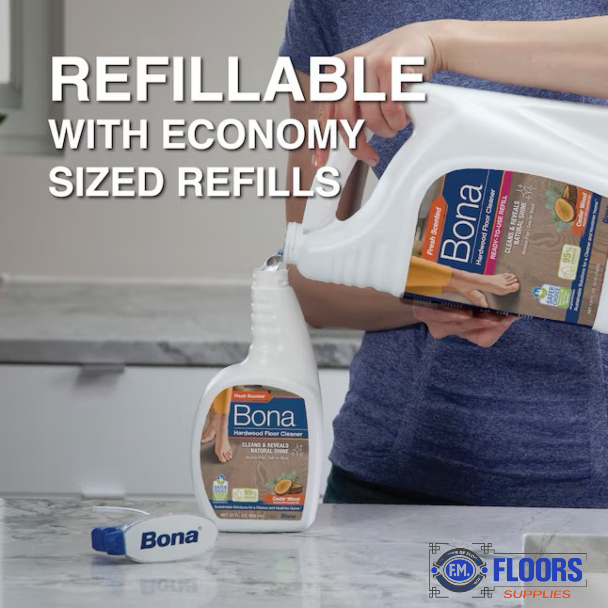 REFILLABLE: Refill with any economy-size Bona floor cleaner refill or Bona sustainable concentrate packet