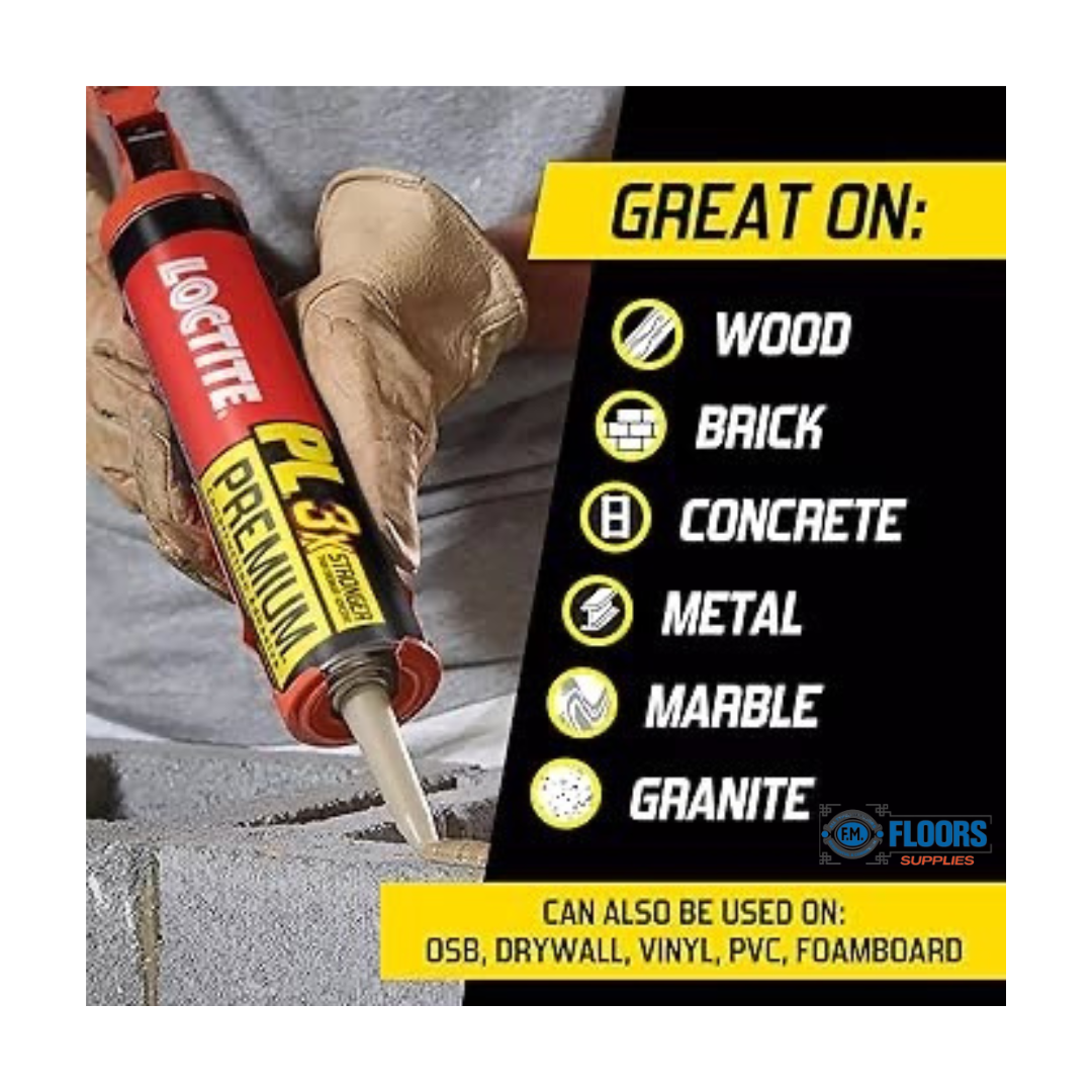Ideal for a variety of projects including sub floor installations, Loctite PL Premium bonds to most common construction materials such as wood, plywood, OSB, MDF, treated wood, hardwood, flooring, concrete, stone, granite, marble, slate, masonry, brick, foam insulation of all sorts including EPS (expanded polystyrene foam), XPS (extruded polystyrene foam), and polysio (urethane) foam, carpets, metal, stainless steel, galvanized metal, lead, cement-based products, fiber cement panels, ceramic, fiberglass, drywall, rigid and cellular vinyl/PVC trim and molding and polyash trim.